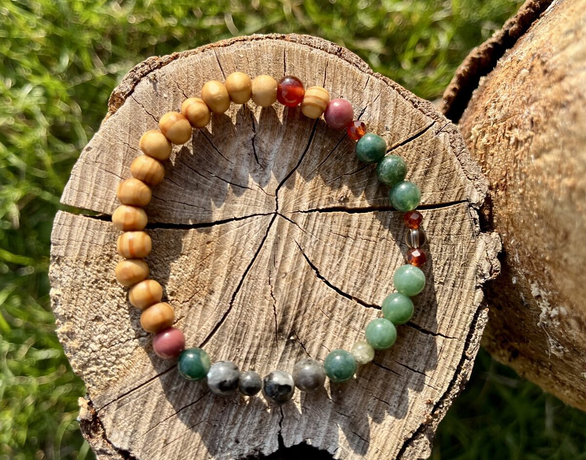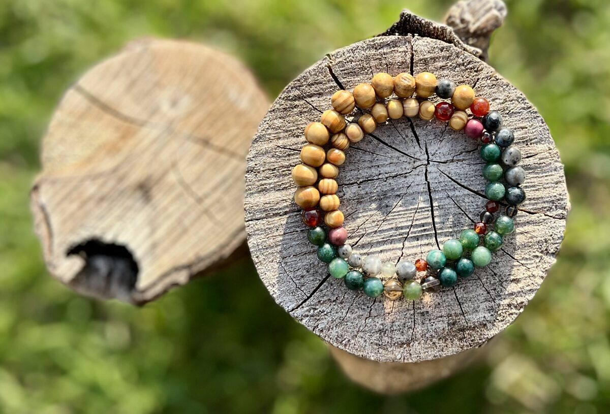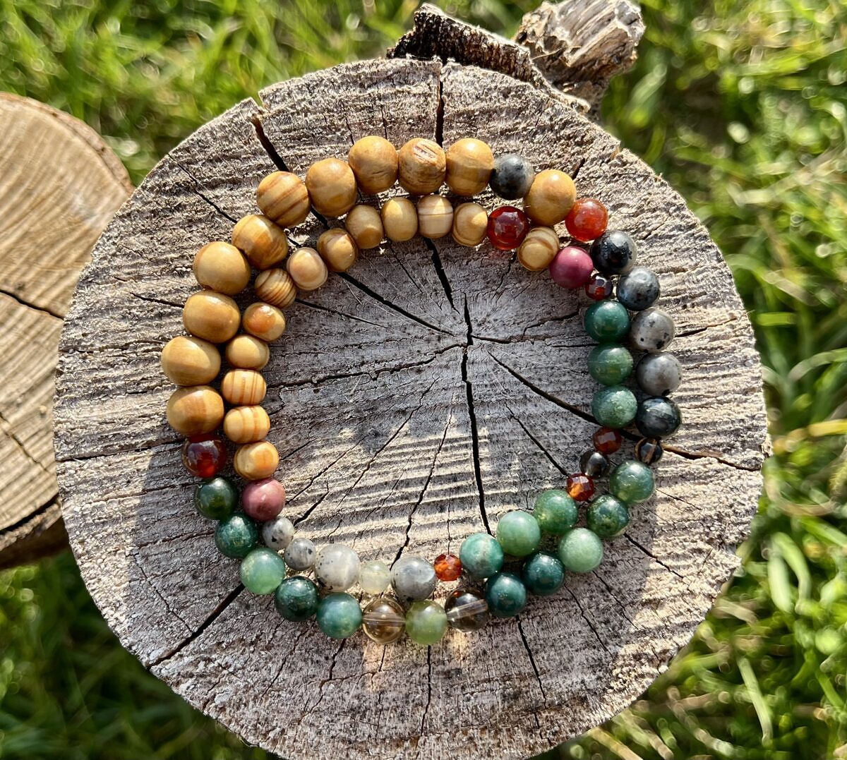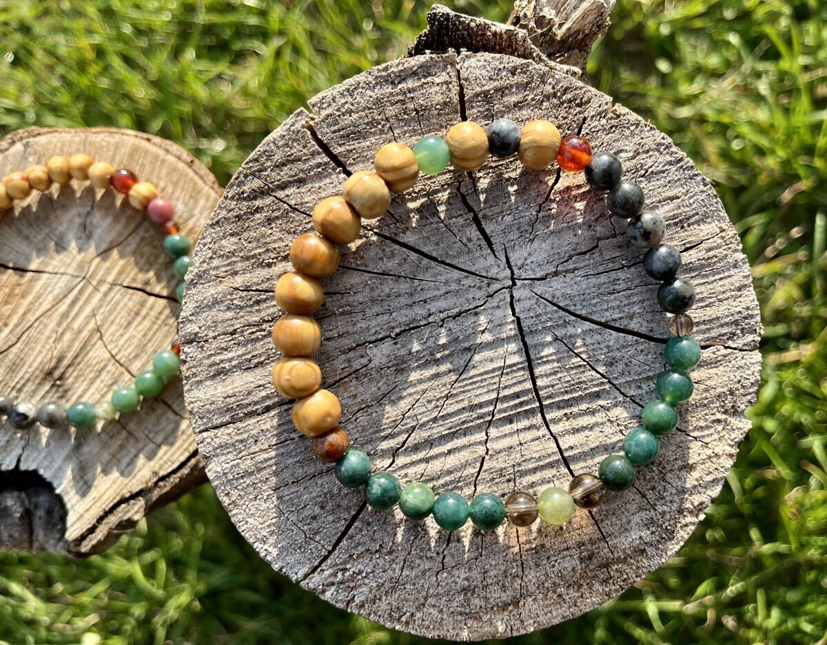 Tyto náramky jsou vyprávěním o lese, který skrývá jak hluboký klid země, tak zářivou energii srdce. Společný základ z mechového achátu, záhnědy a borovice vás ukotví v přítomném okamžiku, zatímco jedinečné akcenty granátu, rodonitu a indiánského achátu určují, zda bude vaše cesta spíše vnitřně klidná, nebo srdečně otevřená.